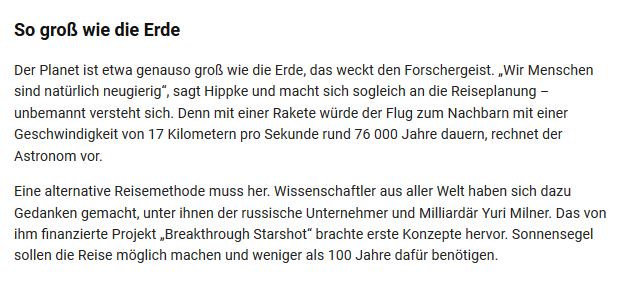 derzeitigen Raketentechnik würde eine solche Reise über 100000 Jahre dauern.