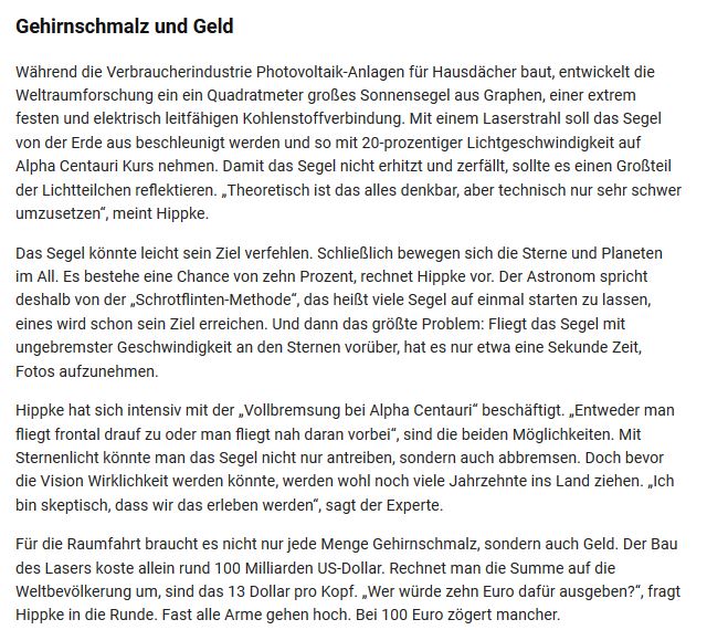 Sonnensegel und einen starken Laser, um eine unbemannte Sonde innerhalb von 20 Jahren Flugzeit nach Alpha Centauri zu senden.
